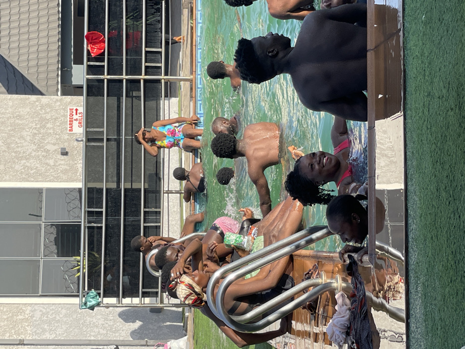 The scene depicts an outdoor swimming pool area in Bukuru, Nigeria, under bright daylight