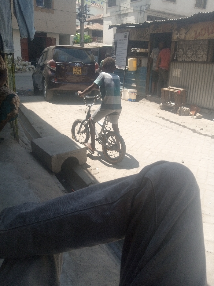 The image depicts a sunny street scene in Tudor ward, Kenya. A young boy with dark skin, wearing a light blue and white striped t-shirt and light-colored shorts, rides a black BMX bicycle towards the right mid-ground. He wears flip-flops. Behind him and to the left, a maroon Toyota SUV with Kenyan license plate KDK 857B is parked on the paved street. To the right, a makeshift structure constructed from corrugated metal sheets serves as a storefront or dwelling, with two partially visible adult males inside. A yellow jerry can and several white buckets are positioned outside this structure, alongside a wooden crate resting on the ground. The street is paved with light-colored interlocking bricks. A concrete drainage channel runs along the left foreground, partially spanned by a rectangular concrete culvert piece. In the immediate foreground, the legs of an individual wearing dark grey trousers are visible, indicating a low observational vantage point. Clothing items are visible hanging on a line in the upper left of the frame. The scene is brightly lit by sunlight, casting distinct shadows.