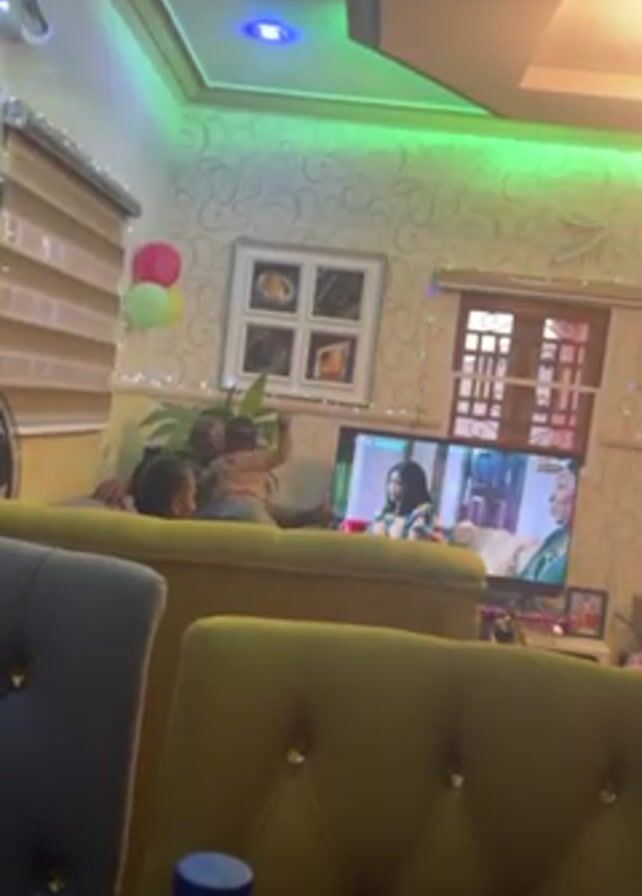 A family is watching television in a living room. The room is decorated with a pattern wallpaper, window blinds, and a framed picture. A green light is emitting from the ceiling. A man is sitting on a yellow couch with two children, a baby and a toddler. The TV is playing a program with a woman visible on the screen. Two chairs, one yellow and one gray, are in the foreground, with a water bottle on a table.