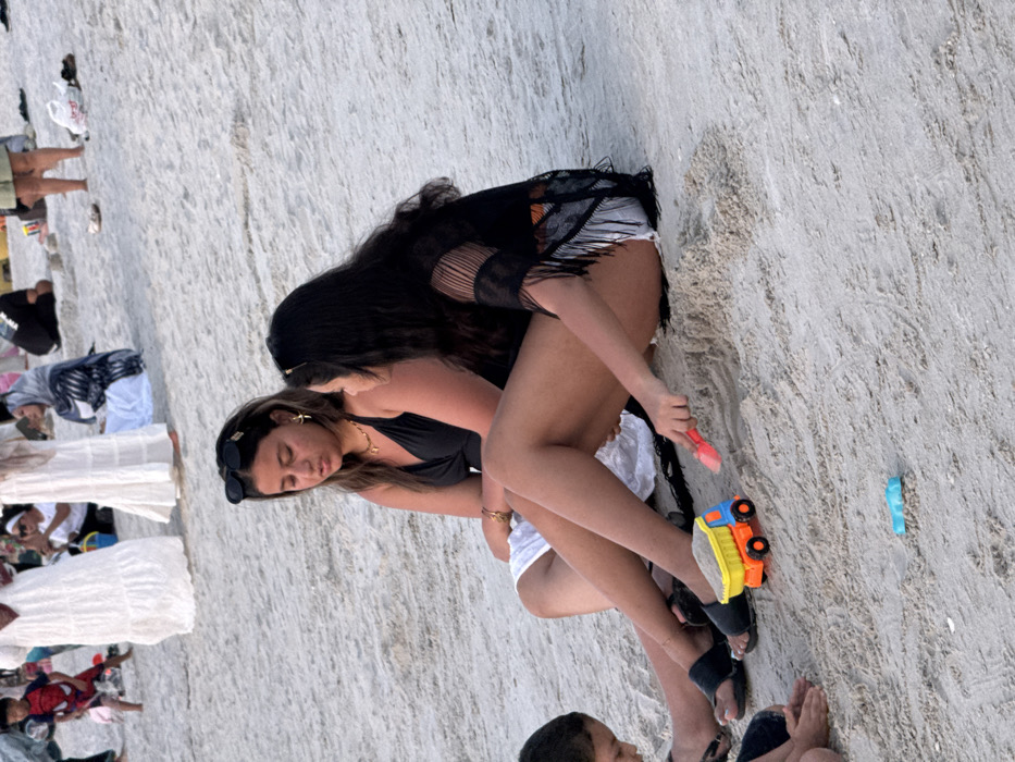 This image depicts a sandy beach scene at Cenang Beach, Malaysia. In the foreground, two adult females are seated directly on the light-colored sand. The female on the left wears a black halter-neck top, white bottoms, black sunglasses on her head, and gold-colored jewelry, including a cross earring and necklace. She has black sandals on her feet. The female on the right wears a black mesh or fringed cover-up over white shorts and holds a pink plastic sand shovel in her right hand, pointed toward the sand. A young male child is partially visible on the bottom left, seated and interacting with the sand. Between these foreground subjects, a small toy dump truck with an orange chassis, blue cab, and yellow bed containing sand is present, along with a small blue plastic toy. In the blurred background, numerous other individuals are visible walking, standing, or sitting on the sand, including a child in a red Spider-Man shirt and adults dressed in various beachwear, some in long white garments or with head coverings. The environment consists solely of sand; no water is visible within the frame.