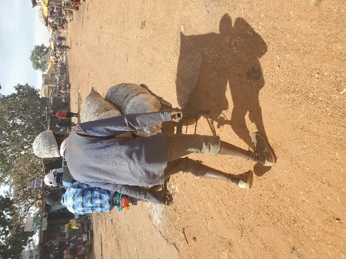 This image depicts a sunlit street scene in Jos, Nigeria. A person, viewed from behind, is centrally positioned, pushing a two-wheeled handcart along an unpaved, reddish-brown dirt road. The individual wears a light-colored knit beanie, a long-sleeved dark blue shirt, and light brown or khaki ¾-length trousers with frayed hems. Dark socks with colorful patterns are visible above light-colored, possibly canvas, low-top shoes. The handcart is loaded with two large, light grey, irregularly shaped sacks stacked vertically. Strong shadows are cast to the right side of the frame, indicating bright overhead sunlight. The road extends into the background, revealing a bustling market area with numerous makeshift stalls and small shops lining both sides of the street. These structures feature various coverings, including corrugated metal and tarpaulins. Several other individuals are visible in the background, including pedestrians and people riding motorcycles. To the immediate left of the central figure, another person in a blue patterned shirt is seated on a motorcycle. Overhead wires traverse the scene above the market stalls on the left. The sky is bright and appears slightly hazy.