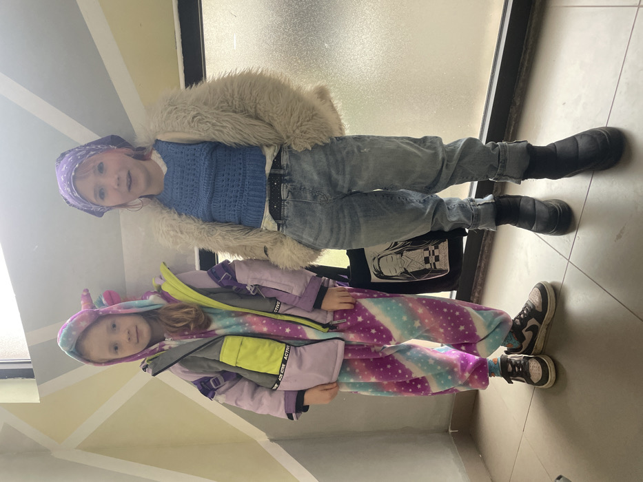 Two young girls pose indoors. The girl on top wears a paisley bandana, a light blue crocheted top, jeans, a fuzzy off-white coat, and black boots. A bag with a black and white image hangs on her side. Below, the second girl wears a unicorn onesie with a purple, teal, and white star pattern. She has on a gray and lavender jacket with a neon green pocket and dark-colored sneakers. The background appears to be a hallway with a window.