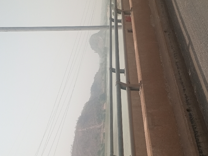 The image displays a panoramic view from a bridge in Jebba, Nigeria, under a hazy sky, likely depicting the River Niger and its surrounding landscape. In the immediate foreground, a dark asphalt road surface is partially visible on the bottom right, with shadows cast upon it. Dominating the lower half of the frame is a reddish-brown concrete bridge barrier, featuring a multi-bar grey metal railing system mounted on its top surface. Beyond the bridge barrier, a wide body of water, appearing calm and light green-grey, stretches across the midground. The far bank of the river is characterized by rolling hills and mountains covered with sparse, faded green vegetation, with visible cleared paths or tracks on some slopes. In the upper mid-ground, multiple parallel power lines or communication cables extend horizontally across the scene. On the far right, a tall, vertical grey pole, possibly a utility or light pole, rises out of frame. In the distant background, obscured by atmospheric haze, further rugged hills and a distinct, prominent rock formation are discernible. No individuals, vehicles, or dynamic actions are present within the frame.