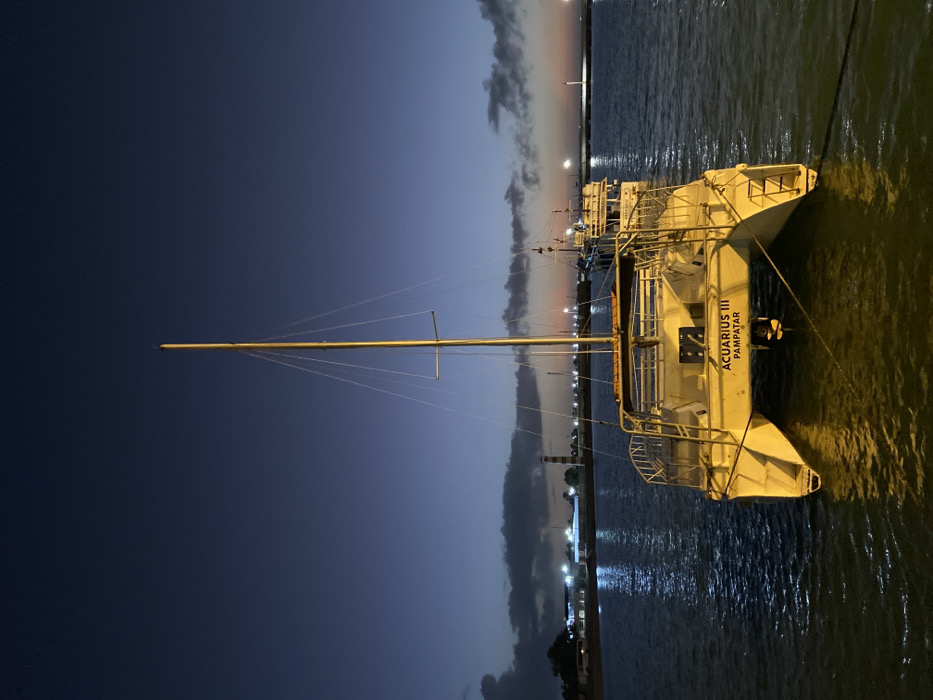 - "The image depicts a white catamaran, identified as "ACUARIUS III PAMPATAR" on its stern, moored in the dark waters of a harbor or marina in Punta de Piedras, Venezuela" by FM-49R4h1, licensed under CC BY 4.0