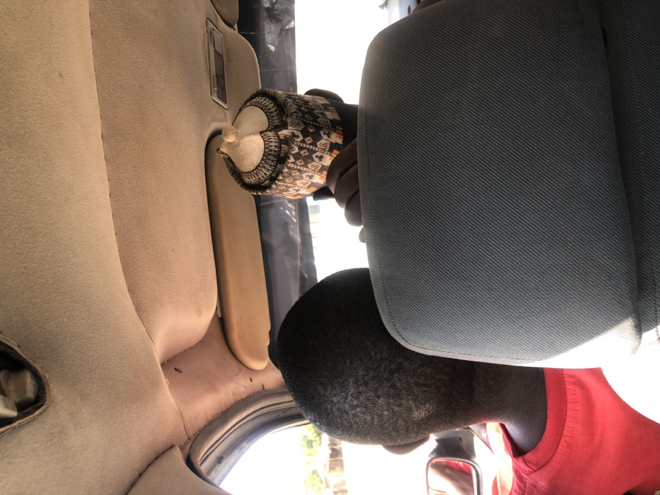 The image depicts the interior of a vehicle, viewed from a rear seat looking forward, within the city of Wai A, Nigeria. Two individuals are seated in front. The person on the left has short, dark hair and wears a red crew-neck shirt; only the back of their head and left shoulder are visible. The person on the right wears a multi-patterned white, black, and orange traditional cap (likely a Kufi) and has a dark-skinned hand visible behind their head, resting near the seat. A grey fabric headrest with a ribbed pattern occupies the lower central portion of the frame. The vehicle's beige headliner is visible overhead, showing signs of wear and minor discoloration. A light-colored sun visor is positioned above the front windshield. Bright daylight is visible through the vehicle's windows, revealing an indistinct exterior environment in the background.