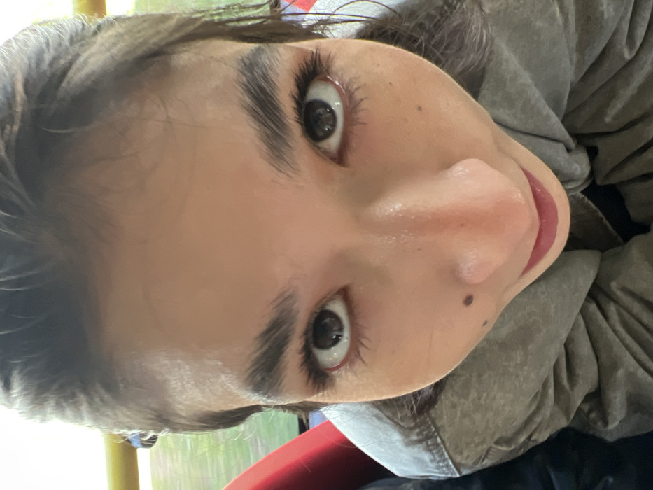 A close-up, wide-angle photograph depicts an individual, likely female, looking directly into the camera