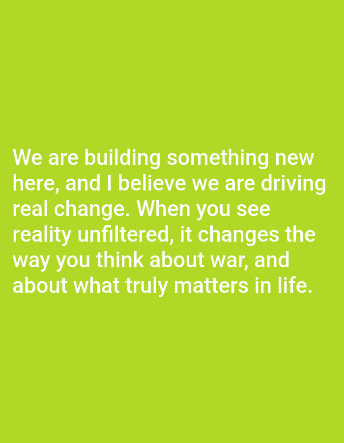 The image is a solid light green background with white text stating: "We are building something new here, and I believe we are driving real change. When you see reality unfiltered, it changes the way you think about war, and about what truly matters in life." There are no visible subjects, objects, or information about Hamburg, Germany in the image.