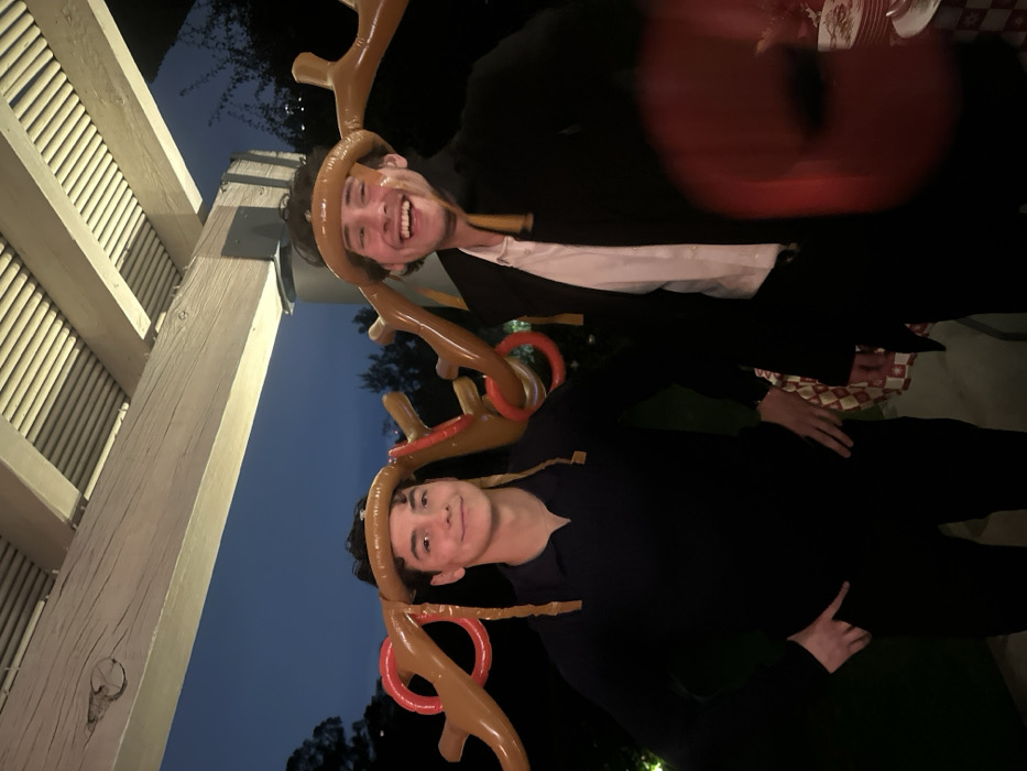 Two young men wear inflatable reindeer antlers. The upper one smiles, with a white shirt visible under a dark jacket. The lower one smiles subtly, wearing a dark top. The background is dark, possibly evening or nighttime. A porch with white posts and a dark sky are visible. In the upper portion of the frame, there are red objects suggesting a festive setting, perhaps a table.