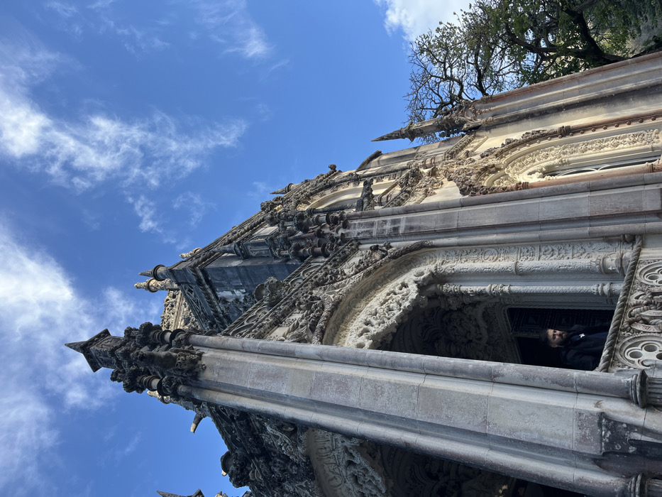 A low-angle shot captures the exterior of a richly ornamented building against a bright blue sky dotted with scattered clouds. The architecture showcases intricate carvings and detailed stonework. At one arched opening, a person is visible. Bare tree branches extend from the building's upper regions. The scene is captured with an upward perspective, emphasizing the height and ornate features of the structure.