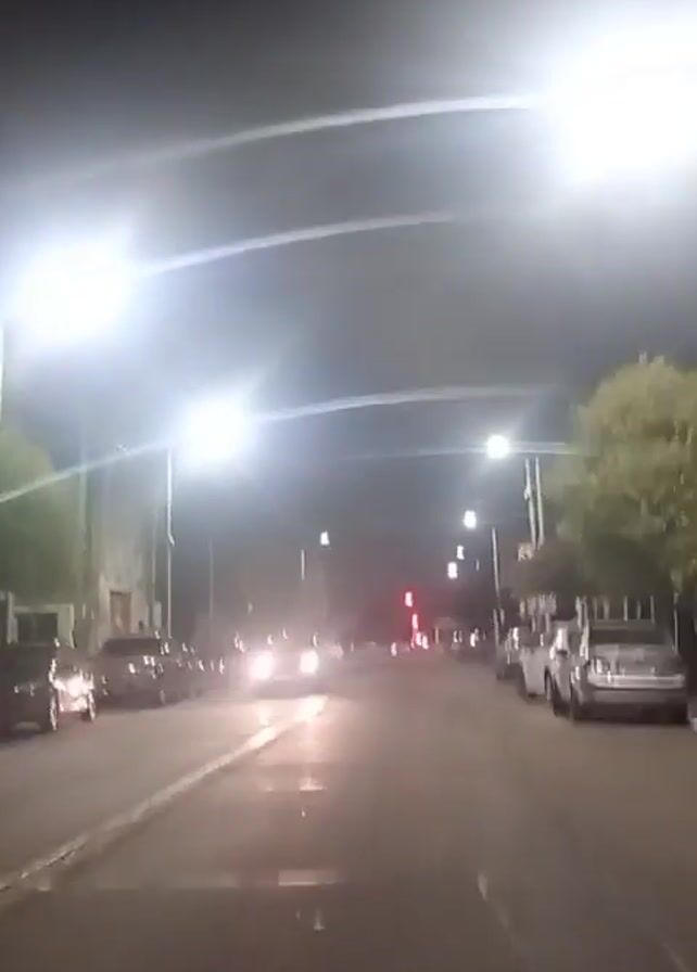 night drive down a residential street. Streetlights illuminate the road and parked cars line both sides. The traffic light in the distance changes from red to green. There are some trees lining the road as well.