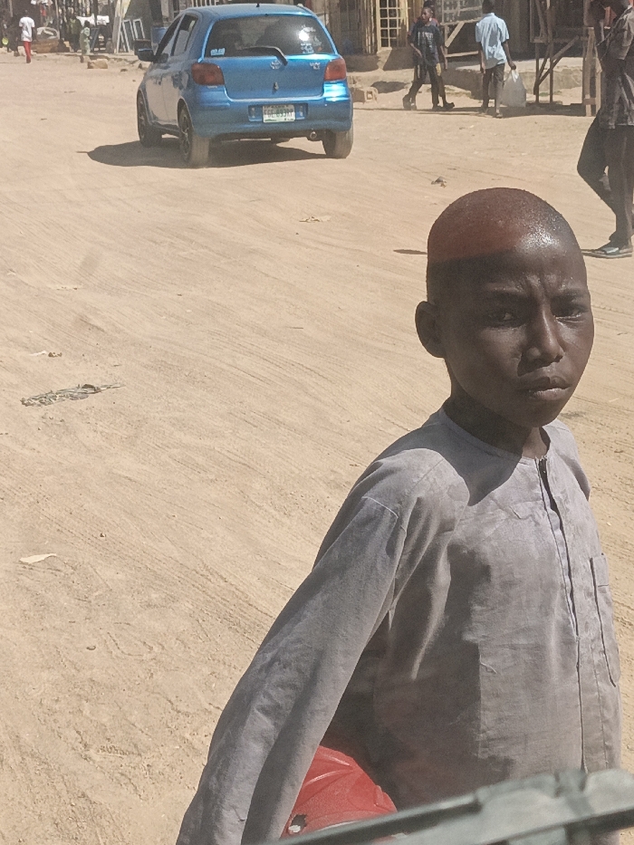 An outdoor scene captured in Hotoro North, Nigeria, features an unpaved, dusty street under bright sunlight. In the immediate foreground, a young male, appearing to be a child or adolescent, with dark skin and a prominent reddish-brown area on his closely cropped hair, looks directly at the viewer. He wears a grey, long-sleeved tunic. A red object is partially visible below his right arm. In the midground, a light blue Toyota Vitz hatchback with Nigerian license plate FGE 03HY is positioned on the dirt road, facing away from the camera. Multiple adult males are visible walking or standing further down the street. The background consists of modest buildings featuring visible metal grates or structures. The overall environment is dusty, indicative of an active urban or semi-urban setting.