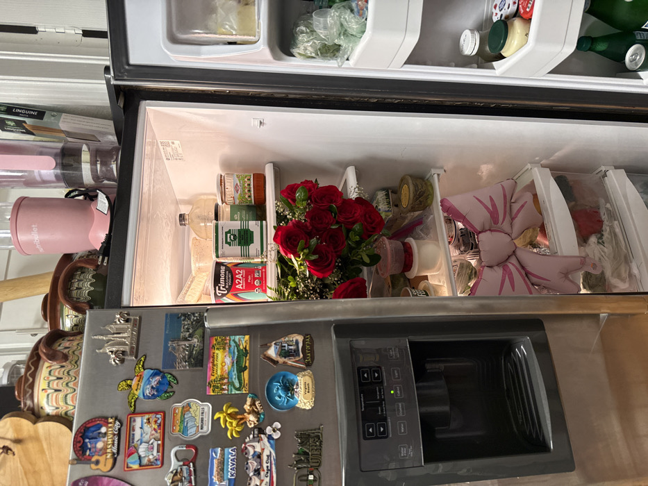 The image displays an open, stainless steel French-door refrigerator situated in a residential kitchen in Naples, Florida, United States. The left refrigerator door, partially visible, is adorned with numerous souvenir magnets, including those depicting Naples landmarks, Nashville, Key West, St. Augustine, Niagara Falls, Everglades, Kavala, Florida, Cape Cod, Virginia, and Dubai. An ice and water dispenser is integrated into the lower section of this door. Inside the brightly illuminated main refrigerator compartment, a large bouquet of red roses interspersed with white baby's breath rests horizontally on a central shelf. The top shelf contains a large clear plastic bottle, a red-labeled container of "Trimona Bulgarian Yogurt A2A2", a green-labeled container, and a jar of red preserve. Lower shelves hold various clear plastic food storage containers and a large, inflated pink foil balloon shaped like a bow. The right-side refrigerator door's internal shelves contain additional bottles and jars, including a green glass bottle at the bottom. Above the refrigerator, a shelf or countertop displays several decorative patterned ceramic pots, a pink Nutribullet blender, and a vertical box of "Linguine" pasta. No individuals are present in the scene, and no specific actions or interactions are depicted.