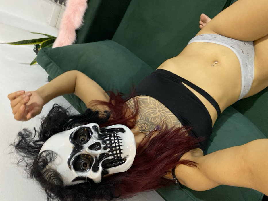 A person lies on a green couch, wearing a black strappy top and gray polka dot underwear. A white skull mask with black accents sits on their head amid dark, wavy hair with auburn highlights. A large floral tattoo is visible on their upper left torso. A plant and a pink fluffy object are in the background. The person has a navel piercing.