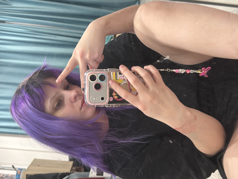 A person with purple hair takes a selfie with a phone in a clear case with stickers. The person is wearing a black shirt. A beaded phone charm with a pink butterfly is attached to the case. The person is making a hand gesture near their forehead. There is a burn or scar visible on the person's arm. The background includes a curtain and furniture.