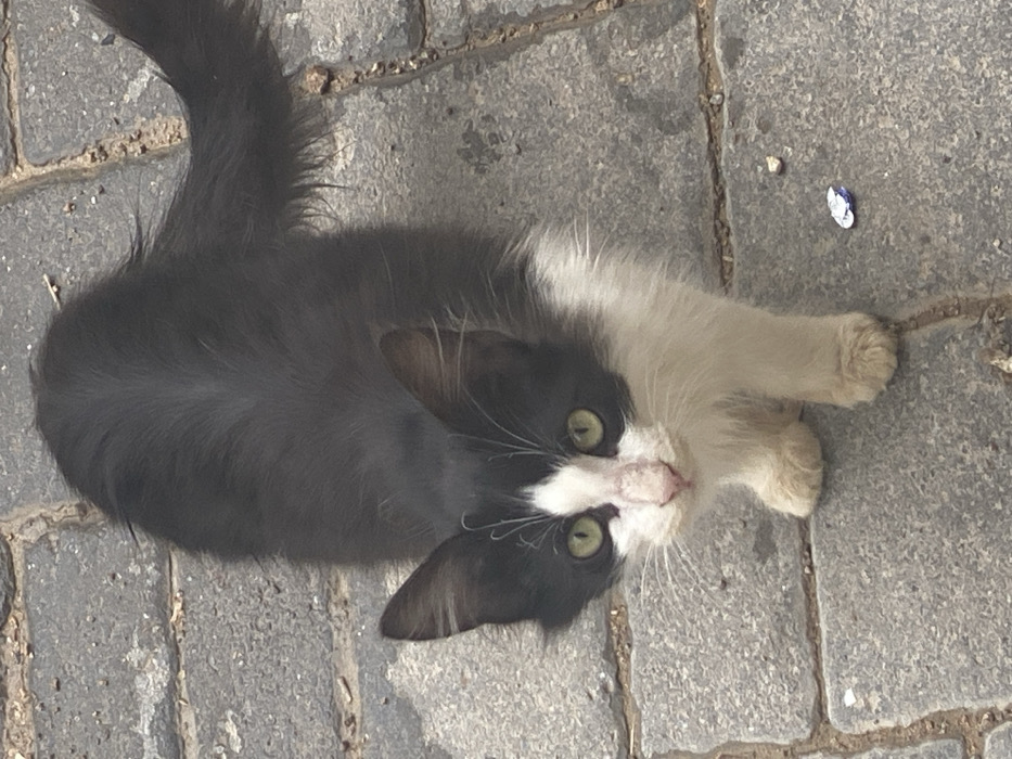 - "An outdoor scene in Fez, Morocco, depicts a small, bicolored domestic cat positioned centrally on a paved surface" by FM-ZyJNa2, licensed under CC BY 4.0