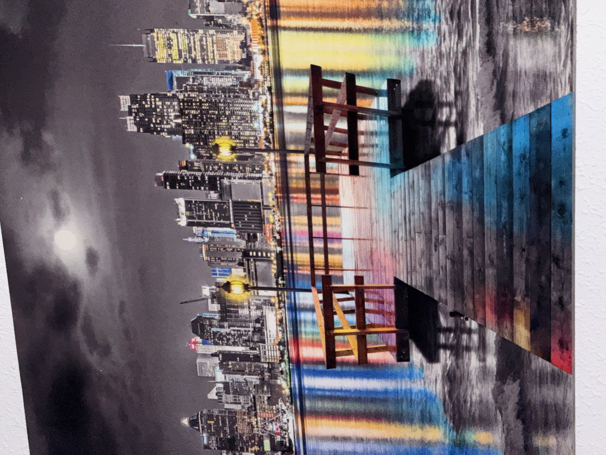 The image depicts a nighttime cityscape viewed across a body of water from a wooden pier