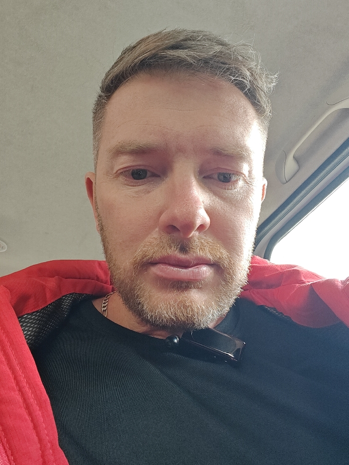 A fair-skinned adult male with light-colored, short-cropped hair and a trimmed beard is depicted in a close-up, head-and-shoulders selfie taken inside a vehicle