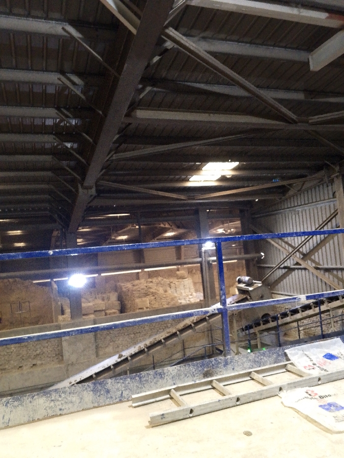 n interior view of a factory located at latitude 22.693 and longitude 90.601 in Pangasia, Bangladesh. The scene is an industrial area with a ceiling composed of corrugated metal panels. There are two large industrial conveyor belts, one on each side of the image. The conveyor belt on the left side of the image is empty. The conveyor belt on the right side of the image is partially obscured by a large white bag with red and blue lettering. A metal ladder sits on the floor to the right of the conveyor belt. The factory is well-lit by fluorescent lights. The floor is covered with a layer of dust. There are no people or other animals in the image.