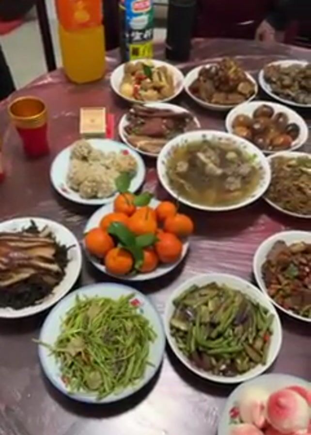 large round table laden with a variety of Chinese dishes. There are multiple plates of food, including meat dishes, vegetables, soup, oranges, and peach-shaped buns. People are seated around the table, and one person uses a spoon to serve soup. There are also bottles of juice and a thermos on the table. The setting appears to be a home dining room.