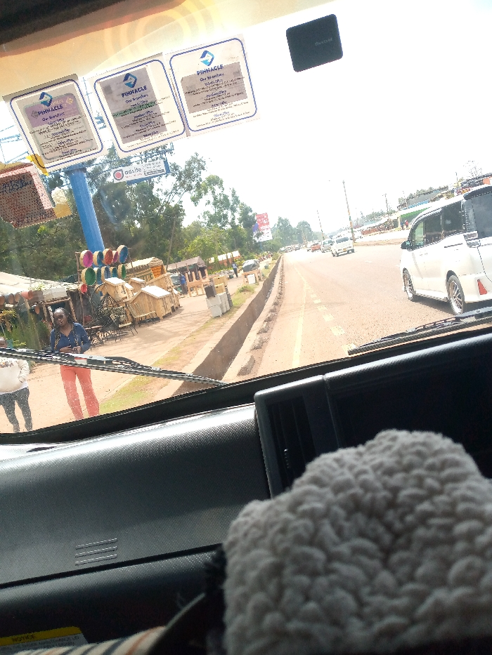 The image depicts a roadside scene in Oloolua ward, Kenya, viewed from inside a vehicle through its windshield. The dashboard occupies the lower foreground, featuring a visible air vent and a white, textured object on the right. Three "PINNACLE" branded stickers and a small black rectangular device are affixed to the upper windshield. Outside the vehicle, a paved two-lane road with a solid yellow center line extends into the distance. A white minivan is visible driving on the right lane, moving away from the camera. Several other vehicles are further down the road. A concrete barrier separates the road from a dirt shoulder on the left. On the left shoulder, an array of outdoor stalls displays various wooden furniture items, including chairs, tables, and small structures. Brightly colored circular objects are stacked on a blue pole next to the stalls, beneath a sign that reads "aasite." Two individuals are visible near the stalls; one, partially obscured, wears a white top, while another, a female, wears a dark blue top and orange pants, facing slightly towards the camera. The background features dense green foliage and trees lining the roadside, with distant buildings visible on the far right under a bright, clear sky.