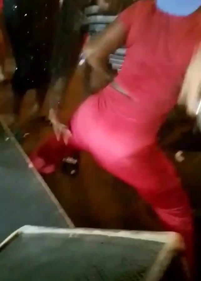 group of people dancing. A person in a red outfit is twerking, with another person in a blue hat facing away from the camera. Other people are visible around them. The environment appears to be a club or party setting.