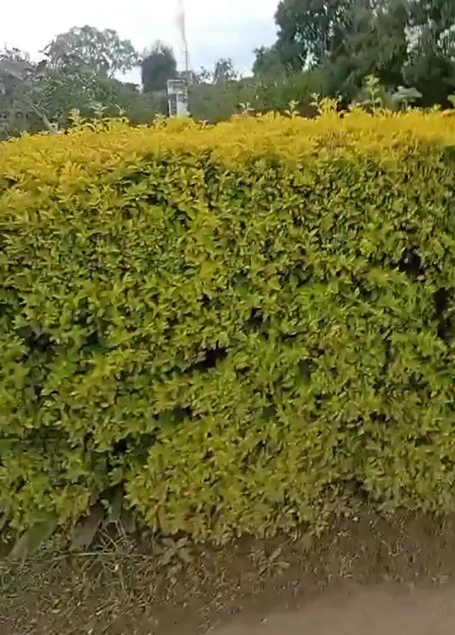 close-up view of a large, well-maintained hedge. The lower portion of the hedge is lush green, while the top part displays a vibrant golden-yellow color. The hedge is neatly trimmed into a rectangular shape. In the background, there are trees and a tall utility pole against a cloudy sky. The camera is likely handheld and moves slightly during the recording. The ground at the base of the hedge is visible, showing some soil and sparse greenery.