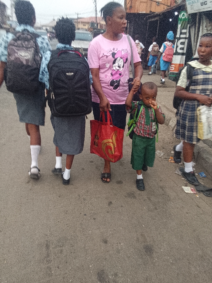 A woman in a pink Minnie Mouse t-shirt holds the hand of a young child in a green school uniform, while walking down a street with other children in school uniforms. Two girls with backpacks are walking on the left. Another schoolgirl in a plaid dress walks on the right. The woman carries a red tote bag. The children are heading to or from school. There is commercial signage on the right of the frame.