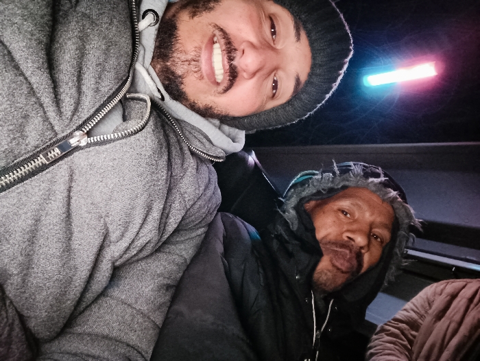 Two men pose for a selfie taken from a low angle at night. The man on the top right has dark hair, a beard, and is smiling, wearing a gray beanie and gray hoodie under a gray puffer coat. The man below him is wearing a hooded black coat with furry trim. His hair is graying, and his tongue is sticking out. A vibrant pink and blue light shines in the background.