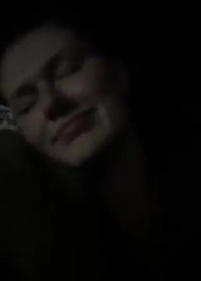 A young woman with blonde hair pulled back smiles and laughs at the camera. She is wearing a dark jacket with a zipper pull and a fur collar. The scene is dimly lit. Music plays.