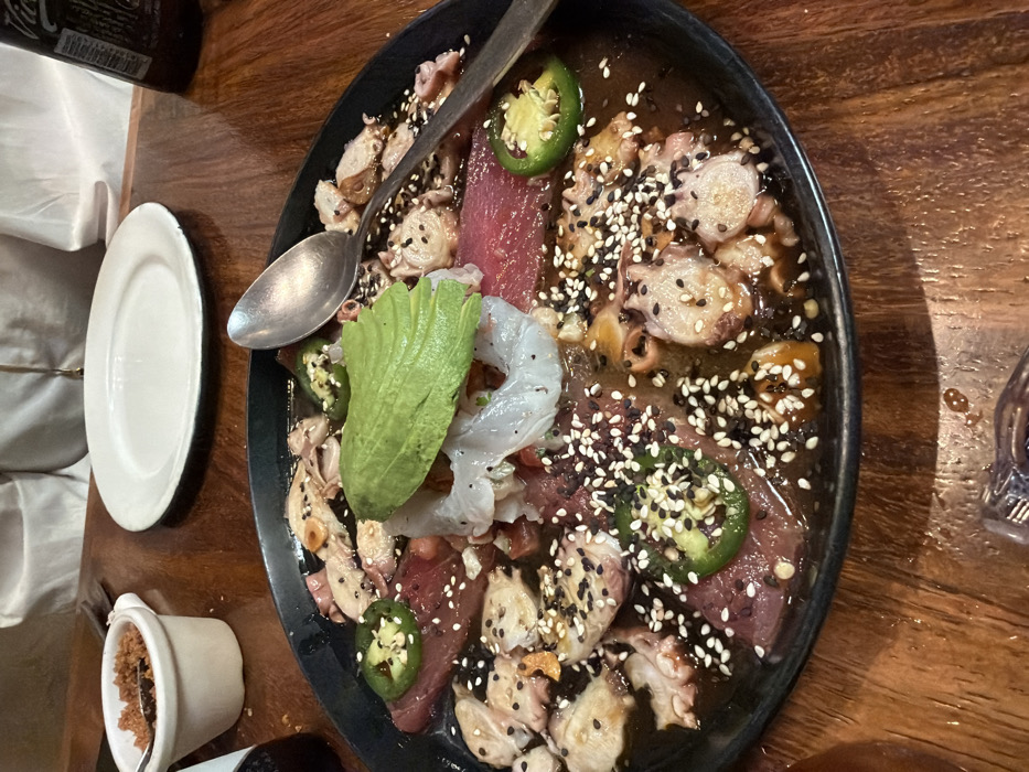 A black plate holds a vibrant ceviche dish. It features raw tuna slices, white shrimp, octopus pieces, and avocado, all liberally sprinkled with white and black sesame seeds. Green jalapeño slices are also scattered throughout the dish. A spoon rests across the top, and a small white dish filled with brown contents sits beside a white plate. The setting appears to be a wooden table.