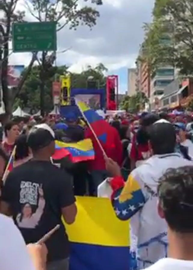 large crowd of people gathered in what appears to be a city street, many waving Venezuelan flags. The crowd seems to be facing a stage where someone is speaking, which is visible in the distance. The environment includes street signs, buildings, trees, and a partly cloudy sky. The crowd is dense and people are closely packed together. The mood seems festive and patriotic.