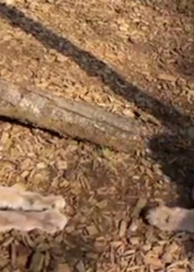 Two caracals are resting on the ground covered with wood chips. A small, weathered branch lies next to the caracal on the left. The caracal on the right opens its mouth slightly and turns its head. A small, shiny object is briefly visible on the side of the caracal on the right. The lighting is bright, creating shadows in the scene.