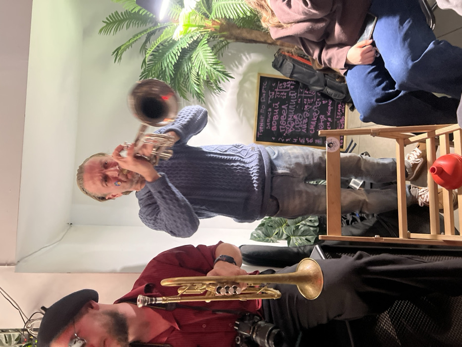 The scene depicts an indoor musical performance or practice session in Ovoshchnoy, Russia. Three individuals are partially visible. On the left, a man wearing a dark beret, sunglasses, and a red long-sleeve shirt holds a brass-colored trumpet and has a black camera hanging from his neck. In the center, a man with blond hair, wearing a light blue cable-knit sweater and light blue jeans, actively plays a silver-colored trumpet; a small blue and yellow sticker is affixed to his right cheek. To the right, a seated person in dark blue pants and a brown top holds a dark smartphone. Behind the central figure, a black easel-style chalkboard displays Cyrillic writing in white and pink chalk, indicating a "Tournament" (ТУРНИР) and a list of names with associated numbers (e.g., ВОВИЙ 27, ПАВЕЛ 30). A large artificial palm plant with green leaves stands to the right of the chalkboard, illuminated by an overhead light. A smaller green plant is visible on the floor to the left. A light wooden folding chair or stool is positioned in the foreground, with a red funnel-like object resting on its bottom rung. A black mesh-covered object, possibly an audio speaker, is partially visible beneath the left man. The walls and ceiling are light-colored.