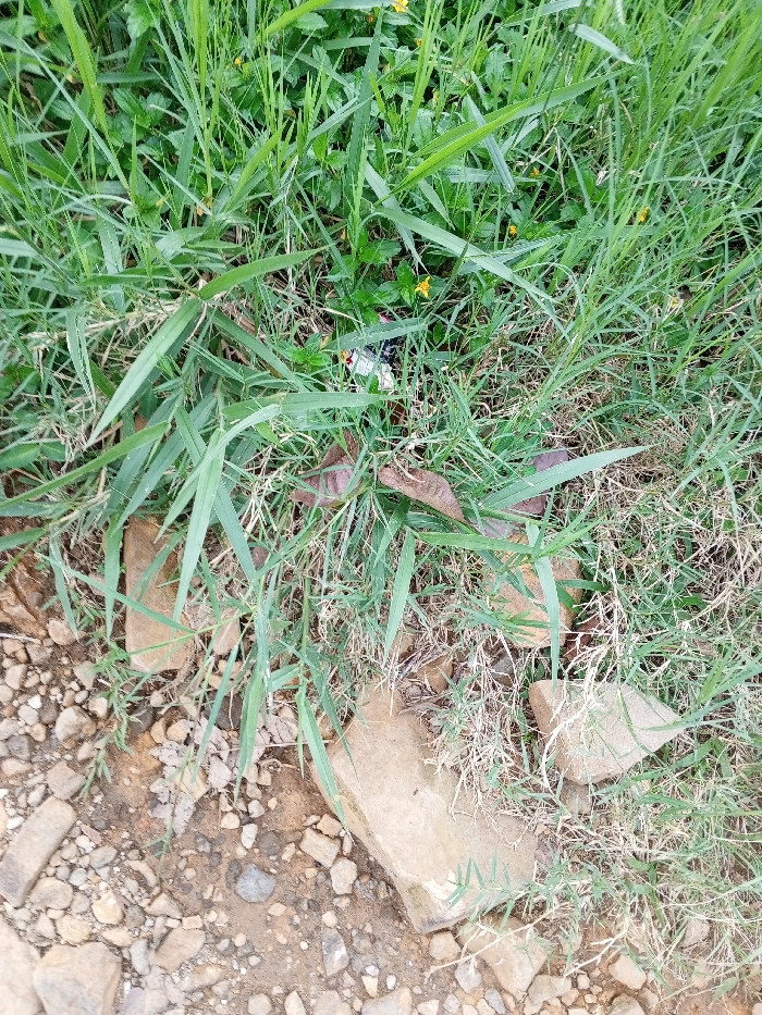 This image depicts a ground-level scene in Thotagamuwa, Sri Lanka. The lower half of the frame presents a dry earthen path, a composition of dirt, various sizes of gravel, and irregularly shaped light-colored stones. The upper half is occupied by dense vegetation, primarily consisting of green grass of varying heights, intermingled with smaller green plants and scattered small yellow flowers. Several brown, elongated, dried organic remnants, consistent with seed pods or leaves, are partially visible within the grass. In the upper-central area, a small cluster of white and dark-colored discarded material, consistent with plastic or paper refuse, is present amidst the foliage. No individuals, animals, or active interactions are depicted.
