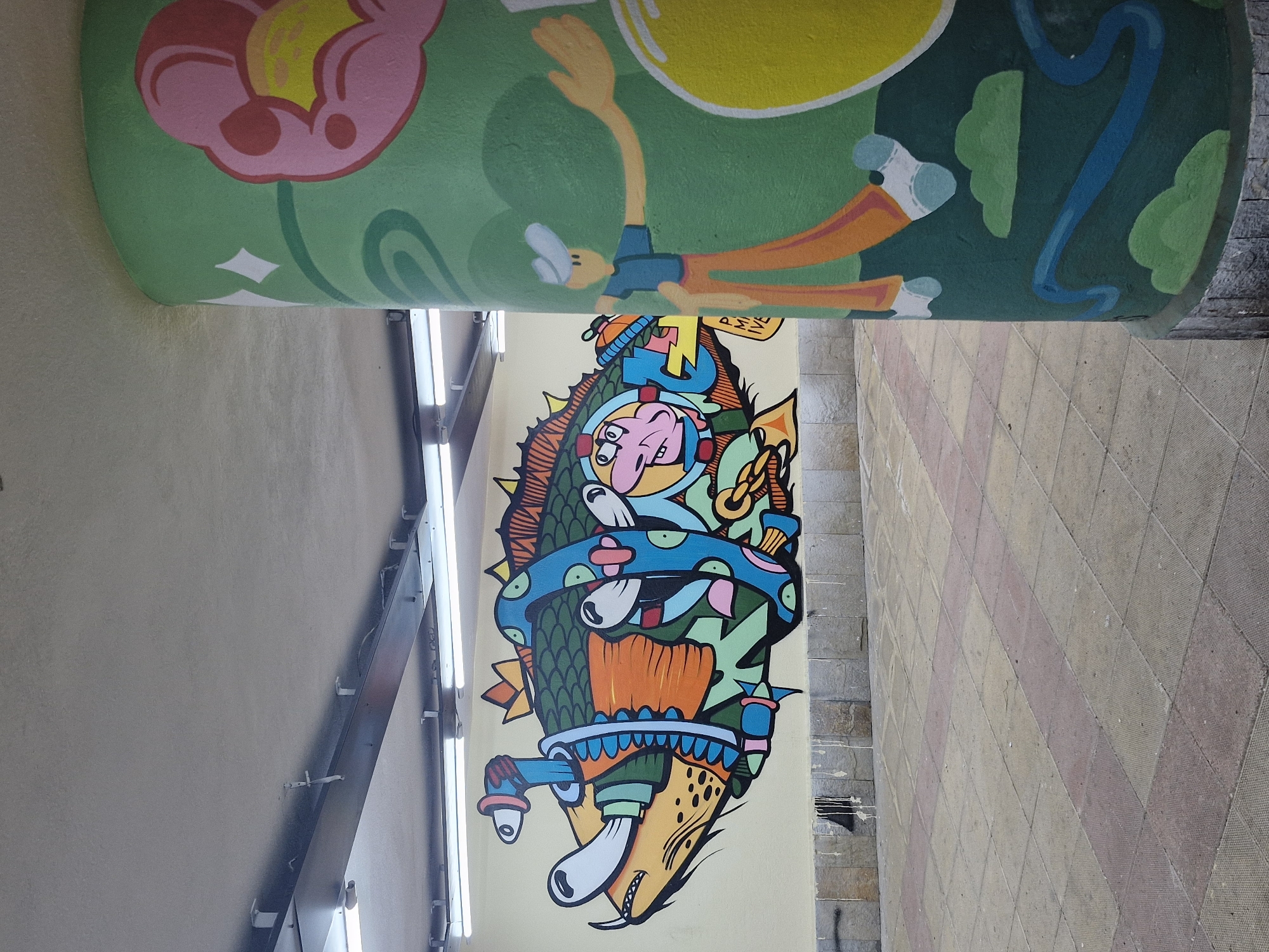 A colorful and whimsical mural adorns a wall in Sofia, Bulgaria. The mural depicts a fantastical, cartoonish creature with sharp teeth and a spiky mane. Above the creature is another mural on a curved surface with a cartoonish person with a long arm reaching upwards. The overall environment is urban, with a street covered in stone paving, with visible lighting fixtures overhead. The murals appear to be located in a public space, likely under a bridge or overpass.