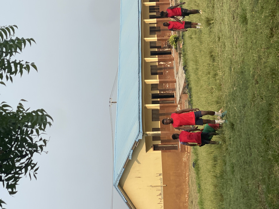 - "A group of people, some in red shirts and dark shorts, are practicing on a grassy field next to a light-colored building with a blue roof" by FM-pK89w1, licensed under CC BY 4.0