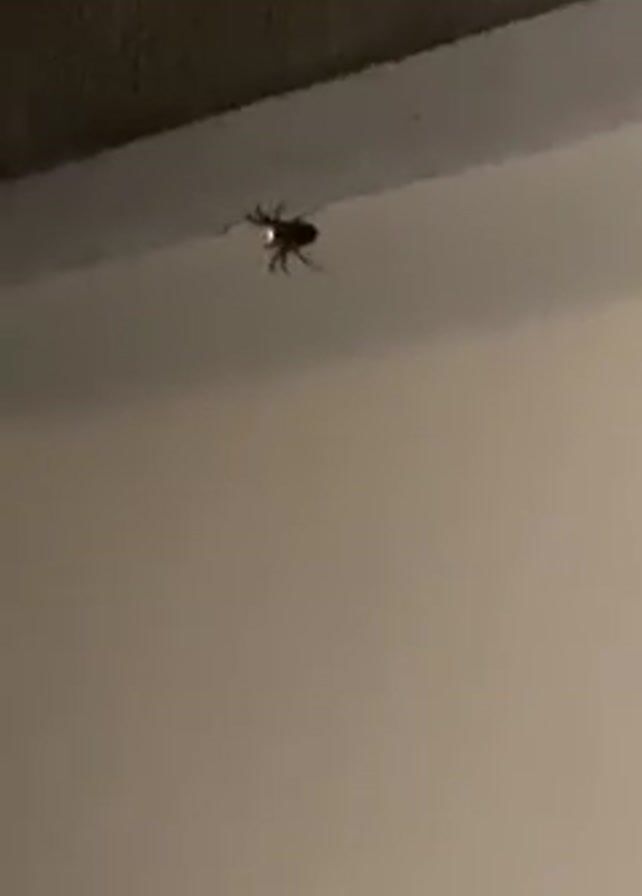 blurry image of a small spider on a white wall, near a brown ceiling or ledge. The spider is dark in color and its legs are visible. The lighting is dim, making it difficult to see details clearly. The camera is out of focus, further blurring the subject.