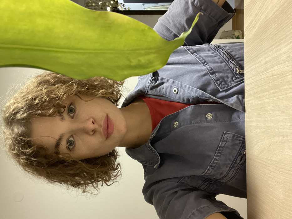 The image displays a close-up indoor portrait of a female subject, identified as being in Boreti, Montenegro. The subject has short, light brown curly hair, green eyes, and a neutral facial expression, looking directly at the camera. She is wearing a dark blue-grey short-sleeved collared shirt with snap button closures down the front and multiple pockets, including one with a zipper on the lower left chest area. A red t-shirt is visible underneath. A large, vibrant green plant leaf partially obstructs the right side of the frame, extending from the top to the lower right. The subject is positioned behind a light wood-grain surface, which occupies the lower portion of the image. The background features a plain white wall on the left side and indistinct, blurred household items on the right, including a decorative light fixture with reflective elements.