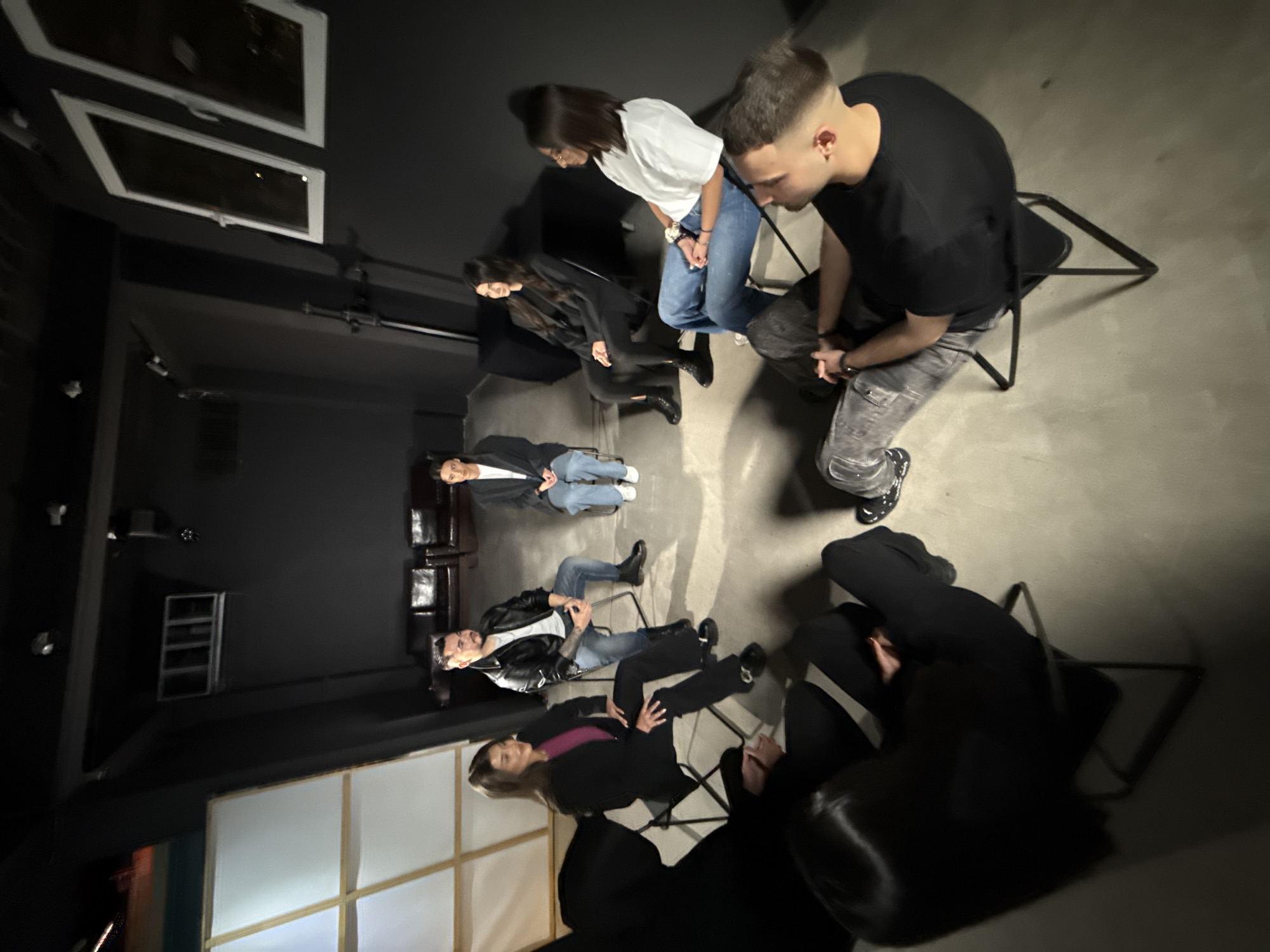 Eight young adults are gathered in an indoor space in Sofia, Bulgaria, seated in a rough circular formation on black folding chairs