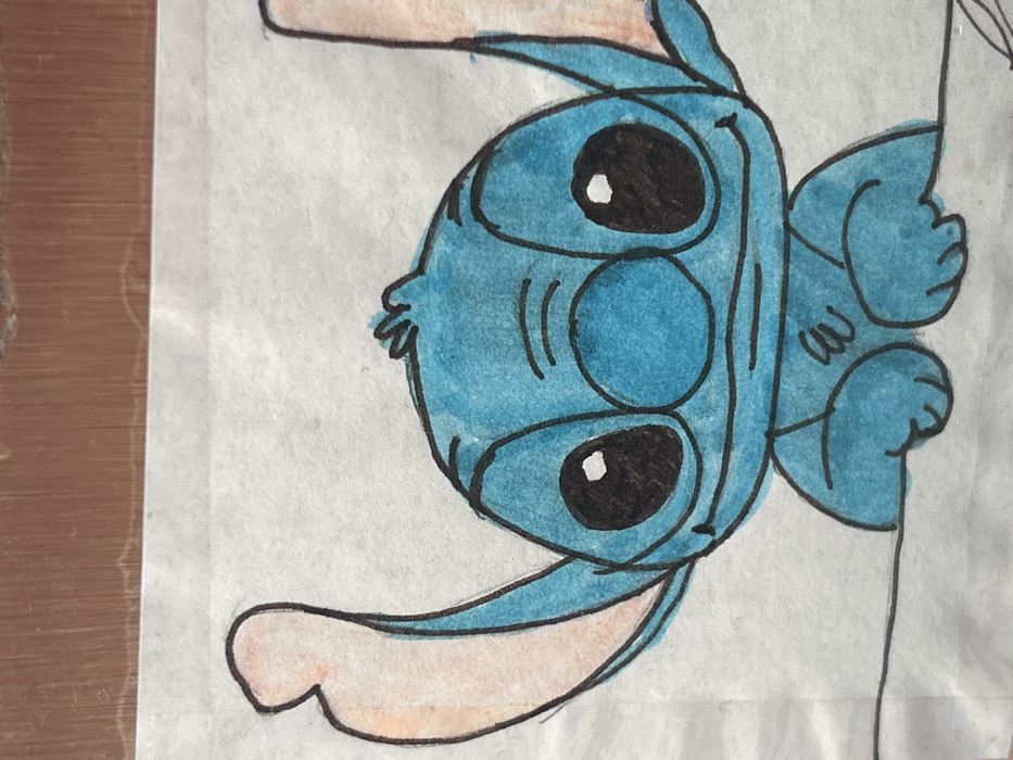The image displays a hand-drawn illustration of the Disney character Stitch, rendered with blue body coloration and light pink inner ears