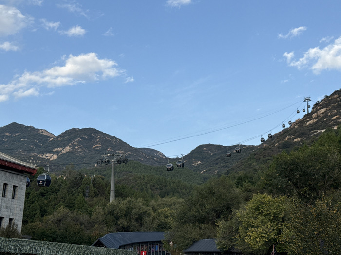 The image displays a mountainous landscape featuring a gondola lift system, located in the Badaling area of Yanqing District, China. The upper half of the frame is a clear blue sky with scattered, small white cumulus clouds. Below, a series of densely forested mountains with visible rocky outcrops dominates the background and mid-ground. A multi-cable gondola lift system traverses the scene diagonally, ascending from the lower-left mid-ground towards the upper-right. Numerous dark-colored, enclosed gondola cabins are suspended from these cables, appearing to move uphill. Several grey metal pylons support the cables, with one prominent pylon centrally located in the mid-ground. In the lower left quadrant, a section of a multi-story building with light-colored exterior walls and a dark, traditional Chinese-style roof edge with red accents is visible. Below this building and extending across the bottom foreground, dark-tiled roofs of smaller structures are partially obscured by dense green and some autumnal-toned deciduous and coniferous trees. No people or specific actions are discernible within the frame. The environment is an outdoor, mountainous setting with established infrastructure for transport or tourism under daylight conditions.