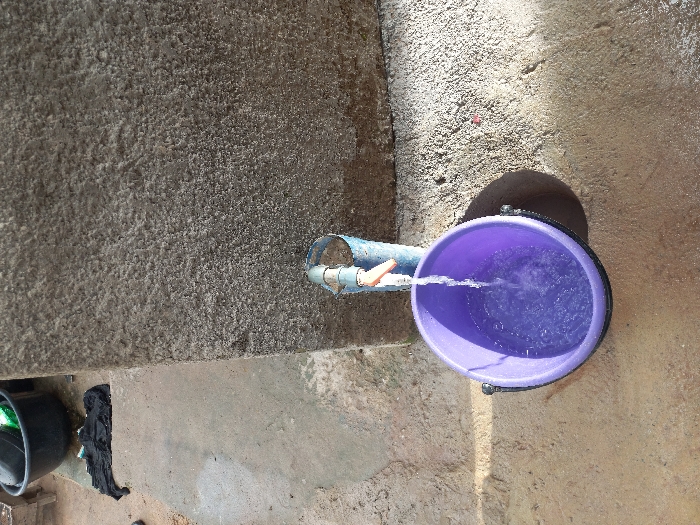 A purple plastic bucket is positioned on a light brown concrete surface, partially filled with water. A steady stream of clear water flows into the bucket from a light blue vertical pipe assembly featuring an orange-handled tap. The ground transitions from a smoother light brown concrete in the foreground to a rougher, darker concrete near a textured, light gray concrete wall that occupies the right side of the frame. In the upper left background, on a slightly elevated concrete slab, several dark basins are visible, one containing a black fabric item. Sunlight casts distinct shadows on the concrete surface, notably from the bucket and the wall. This scene is located in Karmajiji, Nigeria.