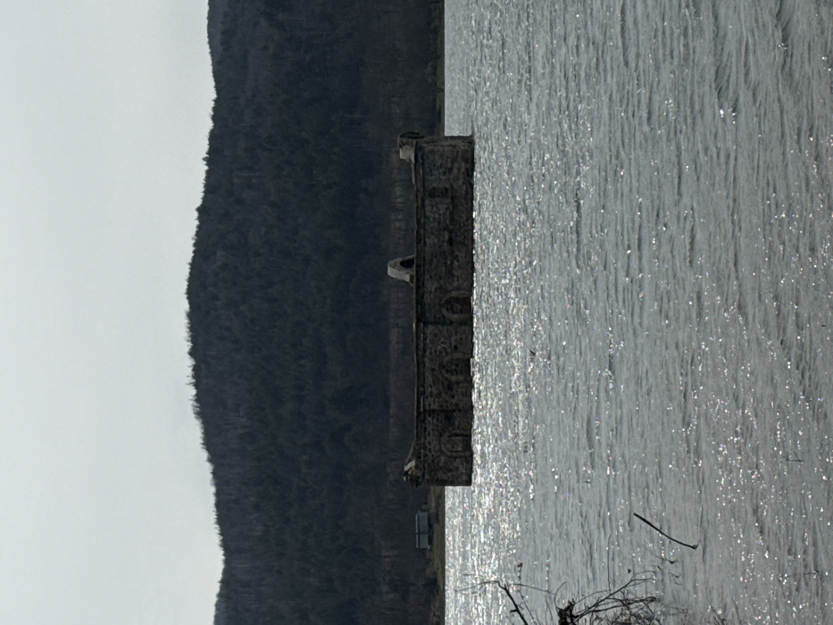 The image displays the partially submerged ruins of the Church of St. Ivan Rilski, situated in the Zhrebchevo Reservoir, near the former village of Zhrebchevo and the village of Zelenik, in Bulgaria. The stone building features a rectangular footprint with several arched window or door openings visible along its exposed walls. Remnants of the roofline and a distinct inverted U-shaped architectural element, possibly part of a former bell tower or decorative arch, rise above the water level. The structure's lower sections are entirely submerged in the dark, rippled reservoir water, which reflects numerous glints of sunlight. In the background, dark, densely forested hills or mountains extend under a light gray, overcast sky. On the far left shore, a small, light-colored structure with a darker roof is faintly visible. The immediate foreground on the left includes several bare, dark tree branches partially immersed in the water. No individuals or overt actions are depicted.