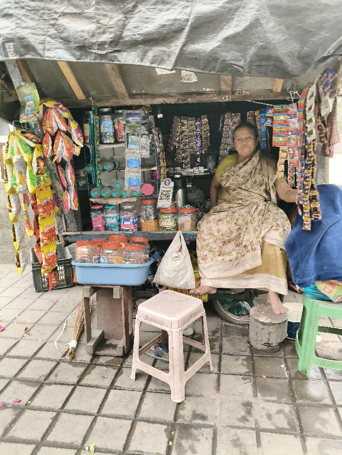 A woman sits in her roadside kiosk, displaying a variety of snacks and drinks. The kiosk is covered by a makeshift awning. The woman wears a traditional sari. Several jars and packages of food are visible on the shelves. A stool sits in front of the kiosk, and a broom leans against the side. The floor is tiled and appears wet. The kiosk seems to be attached to a cart with wheels.
