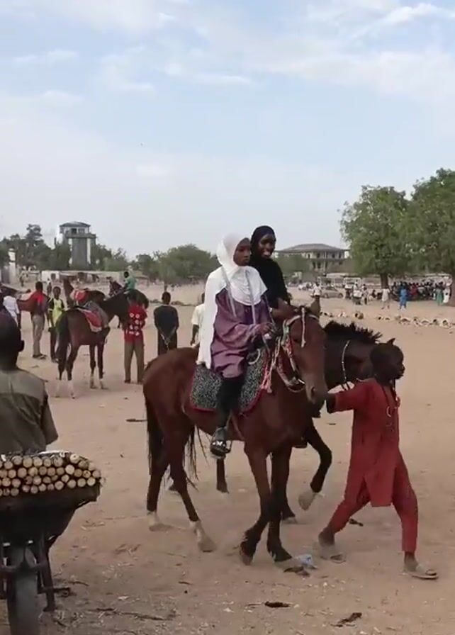 The video depicts a sandy, open area with scattered debris and a crowd of people in the background. Two people are riding on a brown horse, led by a person in a red outfit. The rider in the front is wearing a white headscarf and a purple outfit. A person wearing a striped shirt walks by in the foreground. To the left, a man pushes a wheelbarrow filled with what appears to be firewood. Other people are riding horses in the background.