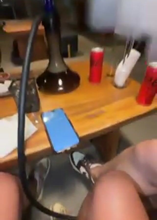 two women indoors. The first scene shows a low wooden table with a hookah, two cans of Coke, and a smartphone with a music interface. One woman's legs and feet, wearing sneakers, are visible. The second scene shows a window view of city lights at night. The third and fourth scenes show the two women sitting and singing along to music, with one holding the hookah hose. The woman in the foreground has long brown hair and is wearing a grey dress. The woman in the background has shoulder-length blonde hair and is wearing a white top. The room appears to have curtains.