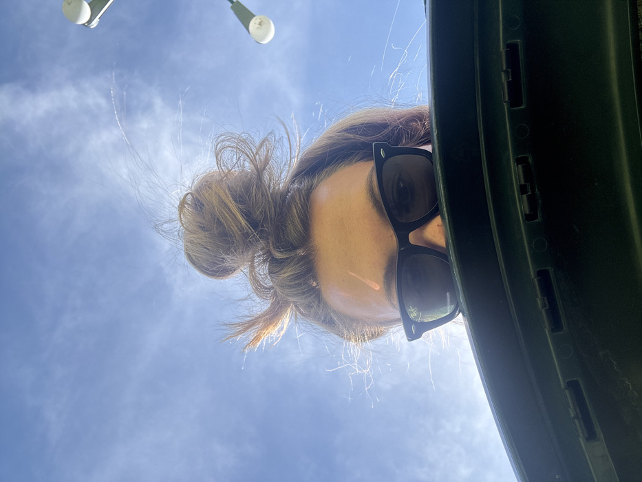 An upward-facing shot features a person wearing sunglasses with their hair in a messy bun. They are looking down at the camera, and the bright sky is visible behind them. A green object is on the right. Two white lights are partially visible in the top left corner against the clear blue sky.