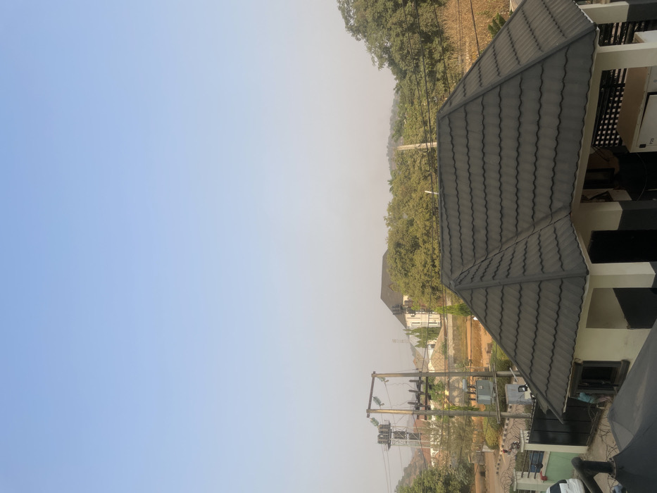 building with a gray tiled roof adjacent to a green landscape. A light blue, almost hazy sky fills the left portion of the frame. Power lines and electrical infrastructure are visible in the middle ground. Some houses are placed among the trees in the background. The orientation of the image is vertical, with a substantial portion showing the sky.