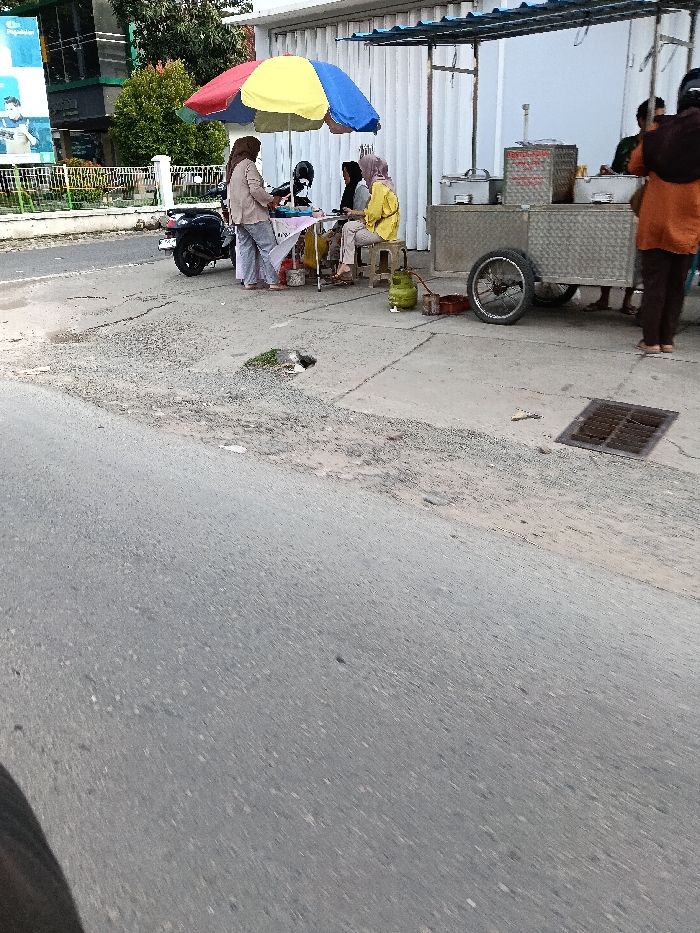 The scene depicts a roadside food vendor operation in Pamotan, Indonesia