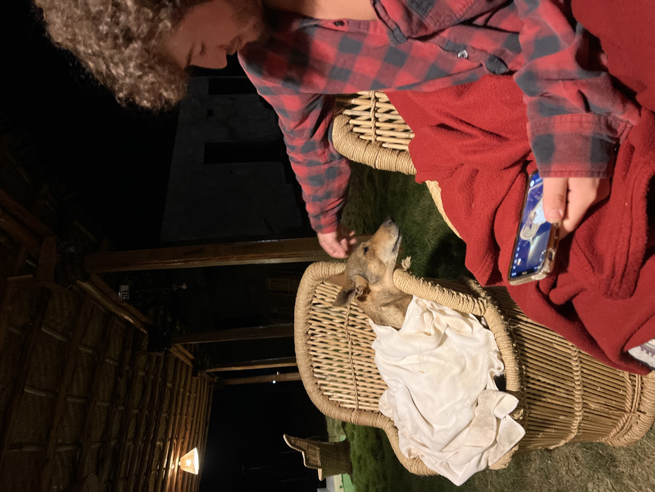 A person with curly hair and a red flannel shirt pets a dog sitting in a wicker chair with a white cloth inside. The dog is looking up at the person. The person is holding a smartphone. The scene appears to be outdoors at night, with a building or structure partially visible in the background and some lighting visible. Another wicker chair is nearby on the lawn.